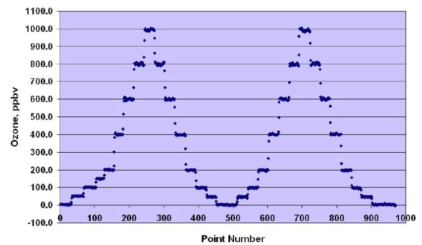 下圖是校準(zhǔn)一臺(tái)Model 202臭氧分析儀獲得的數(shù)據(jù),它以前已經(jīng)被我們一臺(tái)可NIST溯源的儀器進(jìn)行了校準(zhǔn),新的目標(biāo)臭氧濃度每5分鐘被輸進(jìn)本臭氧校準(zhǔn)源里。從數(shù)據(jù)里可以看到,新的臭氧濃度在3個(gè)數(shù)據(jù)點(diǎn)(30秒)內(nèi)被達(dá)到。濃度值被上上下下調(diào)整兩次以產(chǎn)生4條線,目標(biāo)臭氧濃度是0,50,100,200,400,600,800和1000ppbv。在左側(cè)第一組樓梯上還有額外一個(gè)150ppbv的測(cè)量。