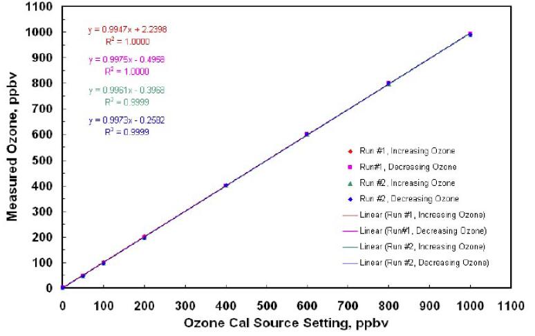 下圖顯示了從臭氧濃度增加和減少中產(chǎn)生的4條校準(zhǔn)曲線。這些數(shù)據(jù)點(diǎn)和用 很小二乘法擬合的線,它們用不同顏色區(qū)分,重合得如此之好以至于難以分辨它們。用線性回歸法擬合的方程顯示出它們的斜率偏差在±1%,截距在±2 ppbv。相關(guān)系數(shù)都是0.9999 或1.0000。