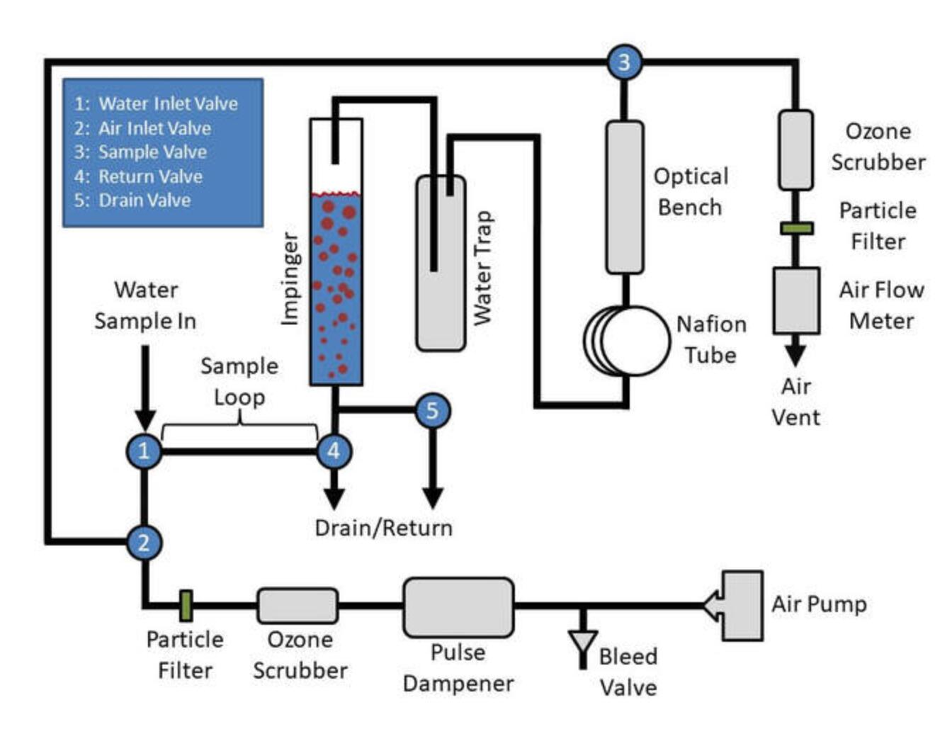 下面的示意圖顯示了儀器操作所需的附加組件。其中包括用于調(diào)節(jié)空氣流速的放氣閥、用于減少氣流波動(dòng)的脈沖阻尼器、用于從環(huán)境空氣中去除臭氧的臭氧洗滌器用于噴射樣品并從排出的空氣中洗滌臭氧、空氣顆粒過濾器、用于保護(hù)空氣的集水器光學(xué)平臺(tái)暴露于液態(tài)水,Nafion 管平衡環(huán)境空氣的濕度,以及空氣流量計(jì)。
