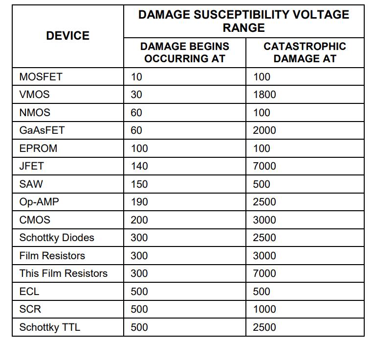 將表中的值進行快速比較,列出了檢測儀器件的敏感性水平,這說明了為什么《半導(dǎo)體可靠性新聞》估計大約 60% 的器件故障是由靜電損壞造成的釋放。